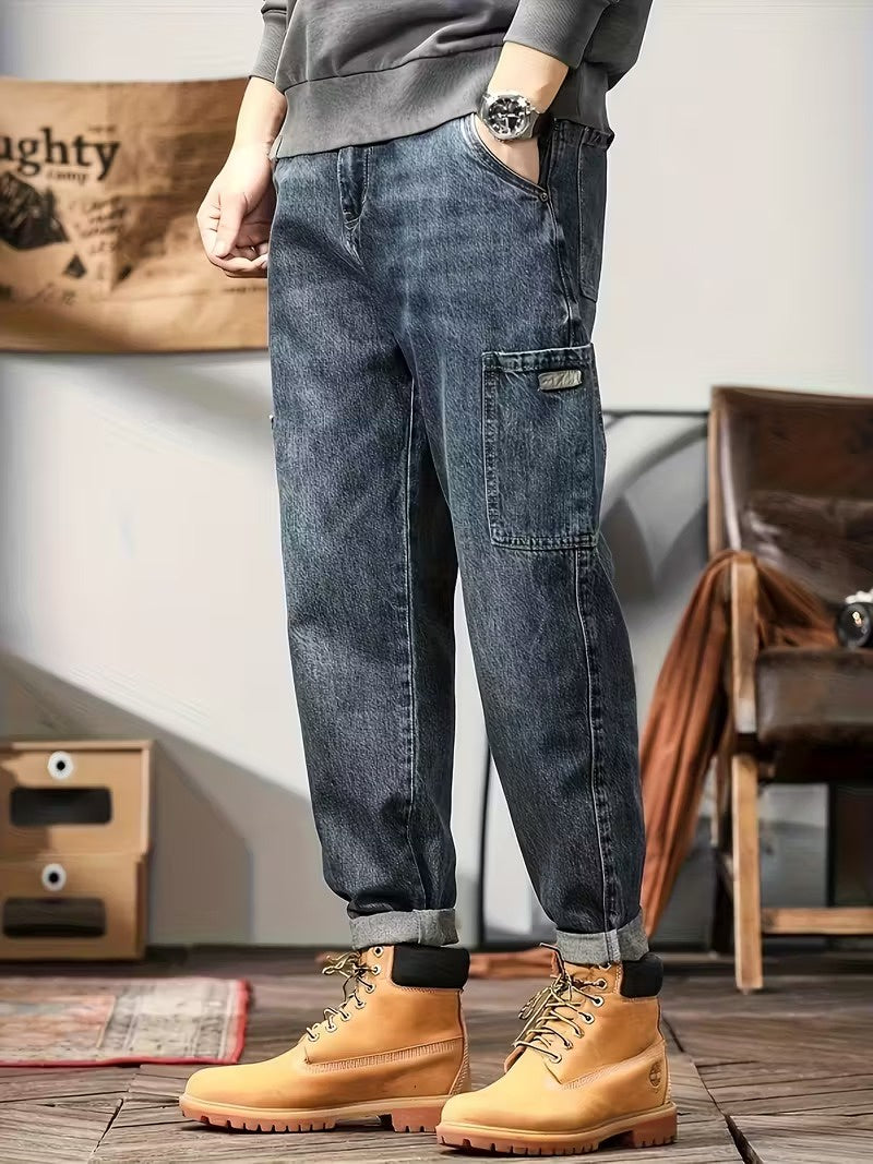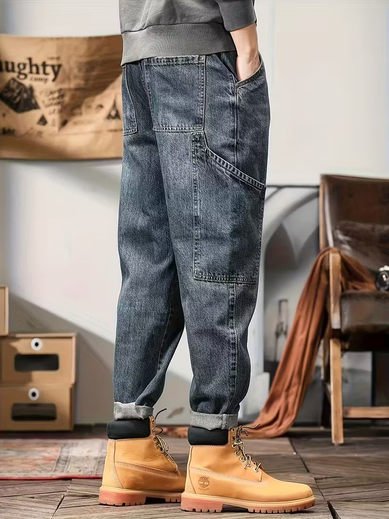 Estos vaqueros de hombre presentan costuras visibles a lo largo de las piernas, incluyendo la zona del muslo superior. Los pantalones incluyen bolsillos frontales inclinados y bolsillos tipo parche en los laterales de las piernas. En la parte trasera cuentan con dos bolsillos tipo parche.
